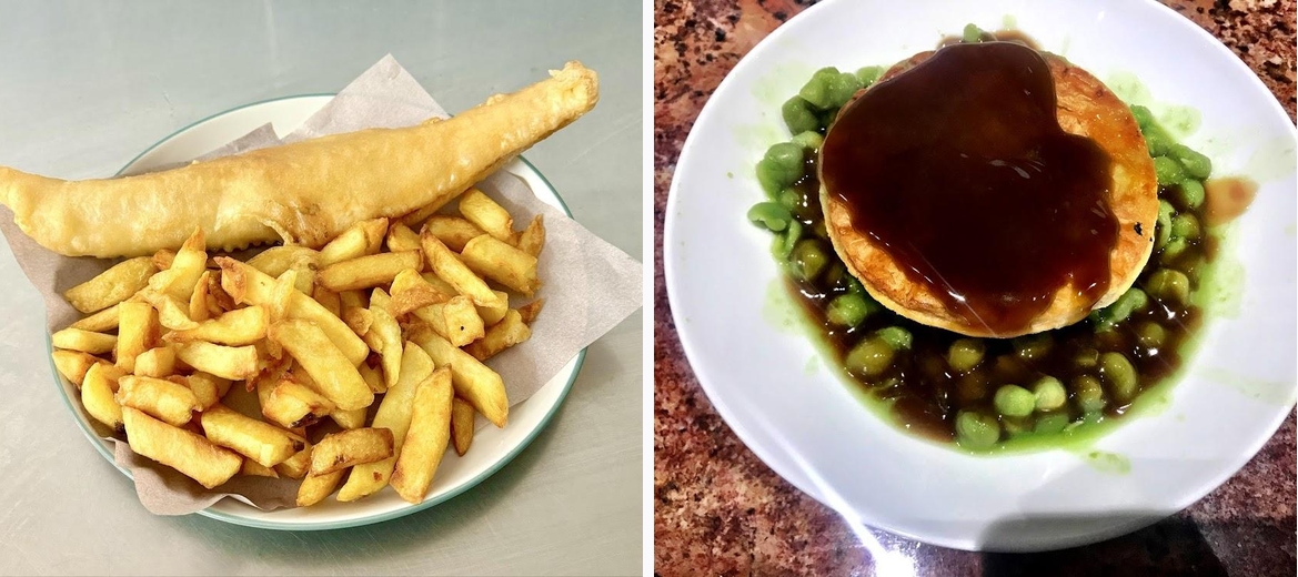 Must-try items include their classic fish and chips, large sausage dinner, and the delicious chicken and mushroom pie. Their portions are generous, ensuring a hearty meal.